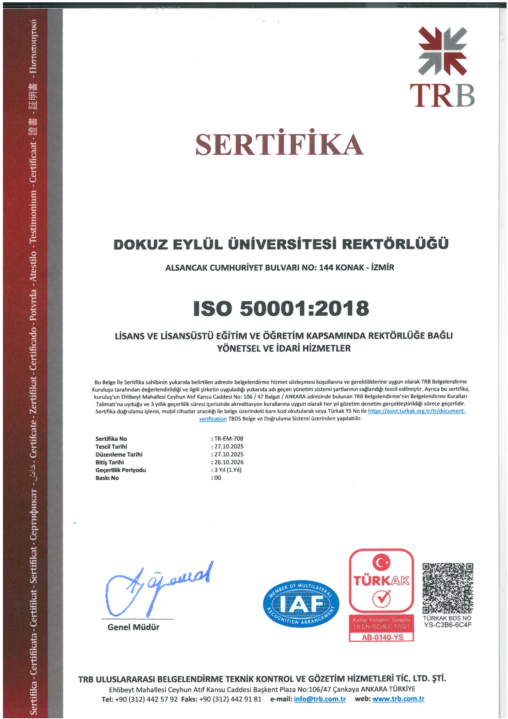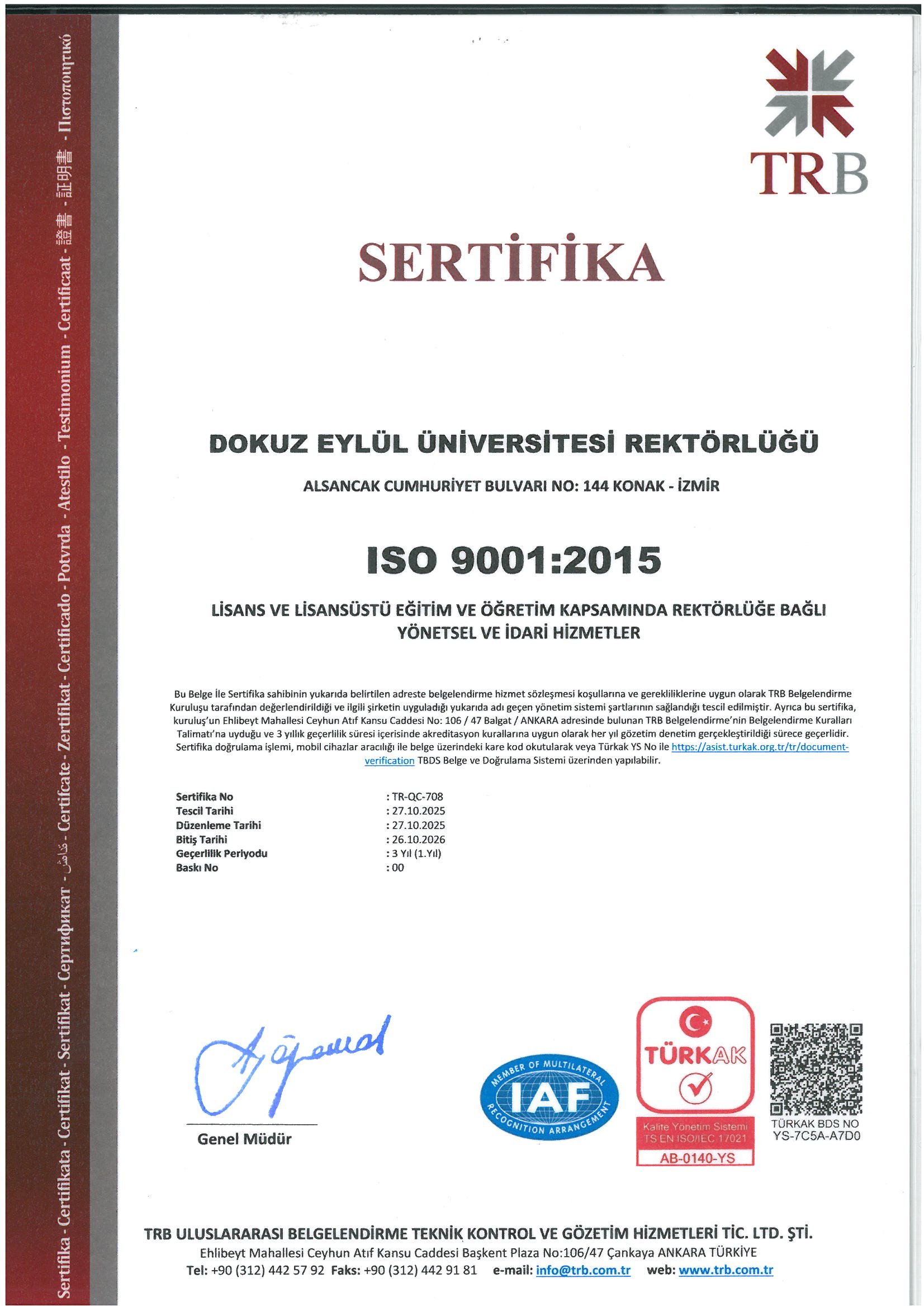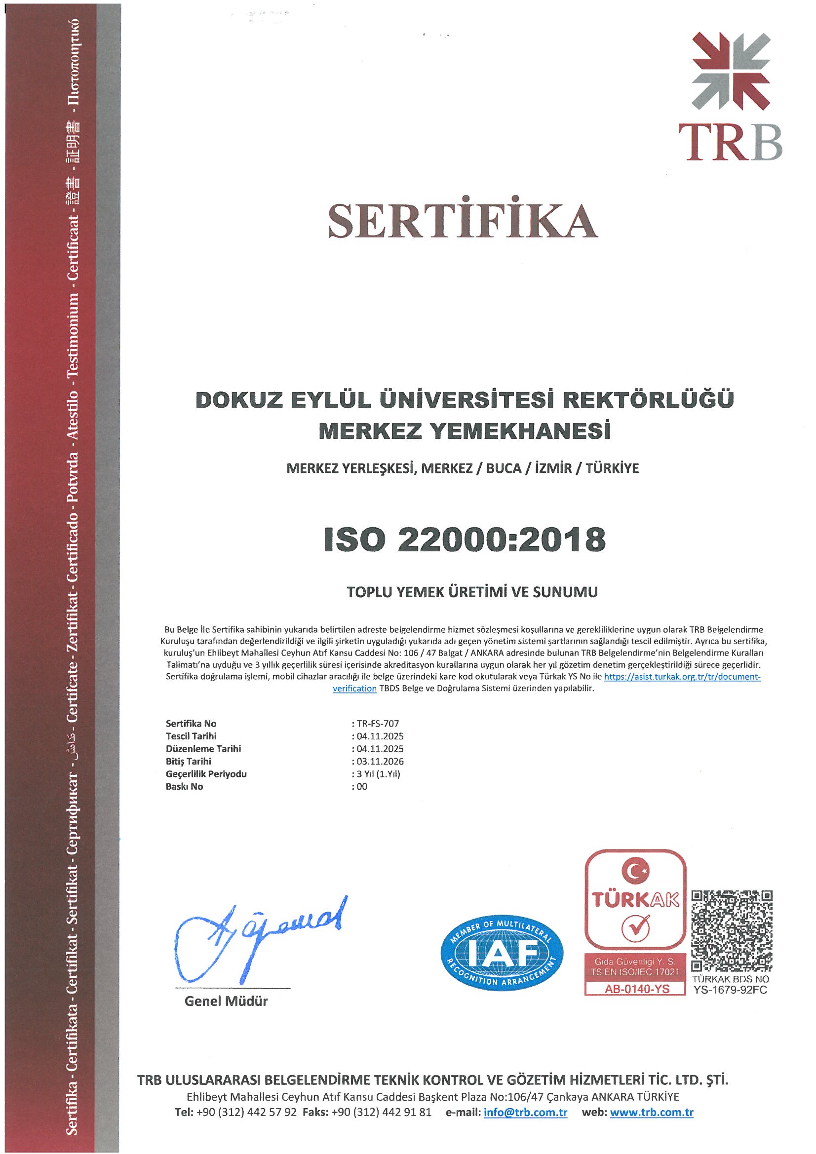 Üniversitemiz Rektörlük bünyesinde Kalite Güvence Sisteminin geliştirilmesi ve iyileştirilmesi yönünde 2021 yılında, ISO 9001:2015, ISO 50001:2018, ISO 14001:2015, ISO 22000:2018 sertifikalarını almıştı. Bu kapsamda söz konusu sertifikalar, 26 Ekim 2025 tarihinde gerçekleştirilen Entegre Yönetim Sistemi (EYS) Dış Denetim süreci sonunda TÜRKAK tarafından onaylanarak yenilenmiştir. Ekte paylaşılan güncel sertifikaları bulabilirsiniz.